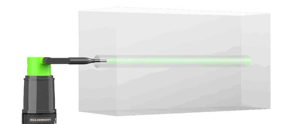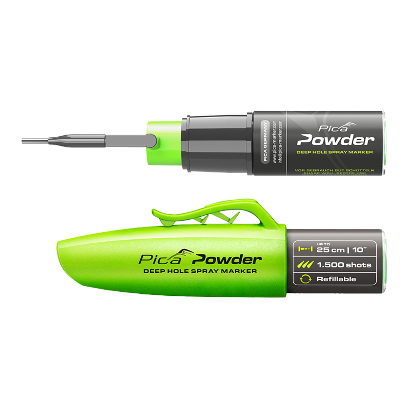 Met de Pica Powder kunnen nauwkeurige en snelle markeringen worden aangebracht door boorgaten tot 25 cm diep. Het laat groene fluorescerende markeringen achter op basis van krijt door te spuiten.